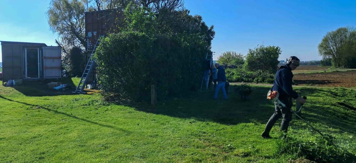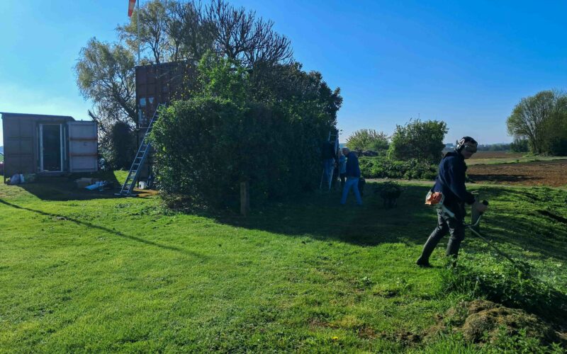 Matinée de travaux chez les Faucheurs : au programme, remise en peinture des containers, application de lasure sur la barrière,