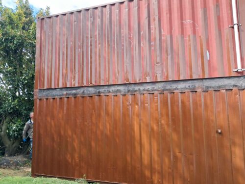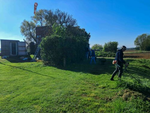 Matinée de travaux chez les Faucheurs : au programme, remise en peinture des containers, application de lasure sur la barrière, taille des haies et débroussaillage des abords du terrain.